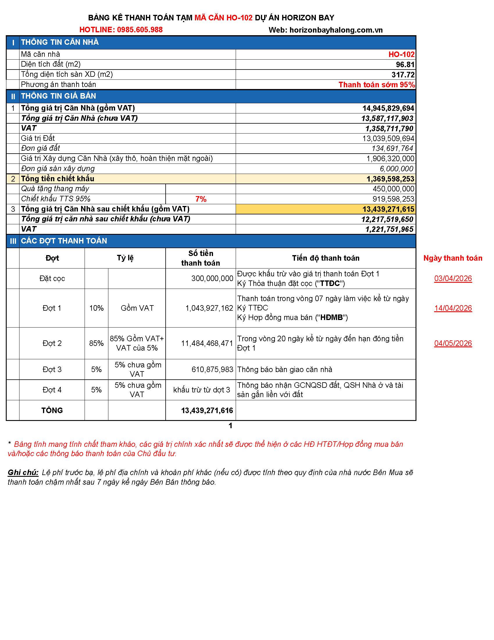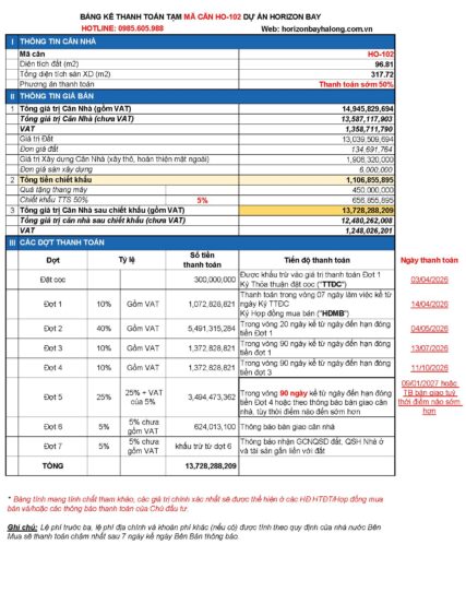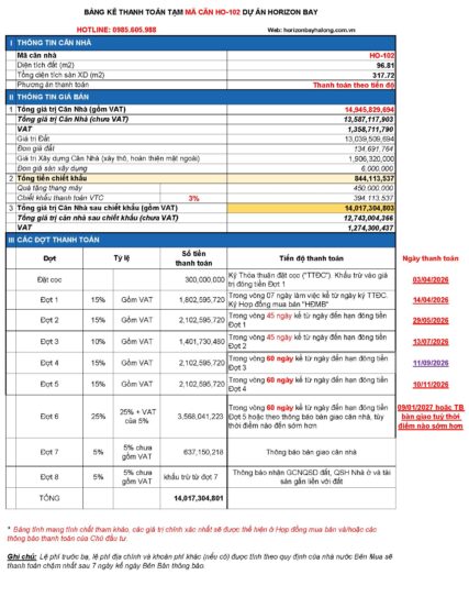 PHIẾU THANH TOÁN CĂN HO-102 DỰ ÁN HORIZON BAY HẠ LONG 2026